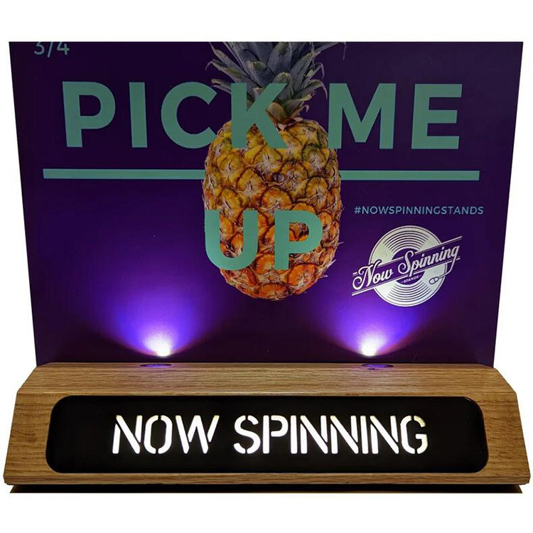 Questo banco di mostra del segno del LED è fatto di legno e del PVC con illuminazione del LED. Ci sono due luci del LED sulla base per evidenziare il grafico del PVC. Inoltre, potete cambiare le lettere nella parte anteriore, che sono inoltre retroilluminate. Il grafico del PVC è intercambiabile, in modo dalla dimensione d'imballaggio è piccola.